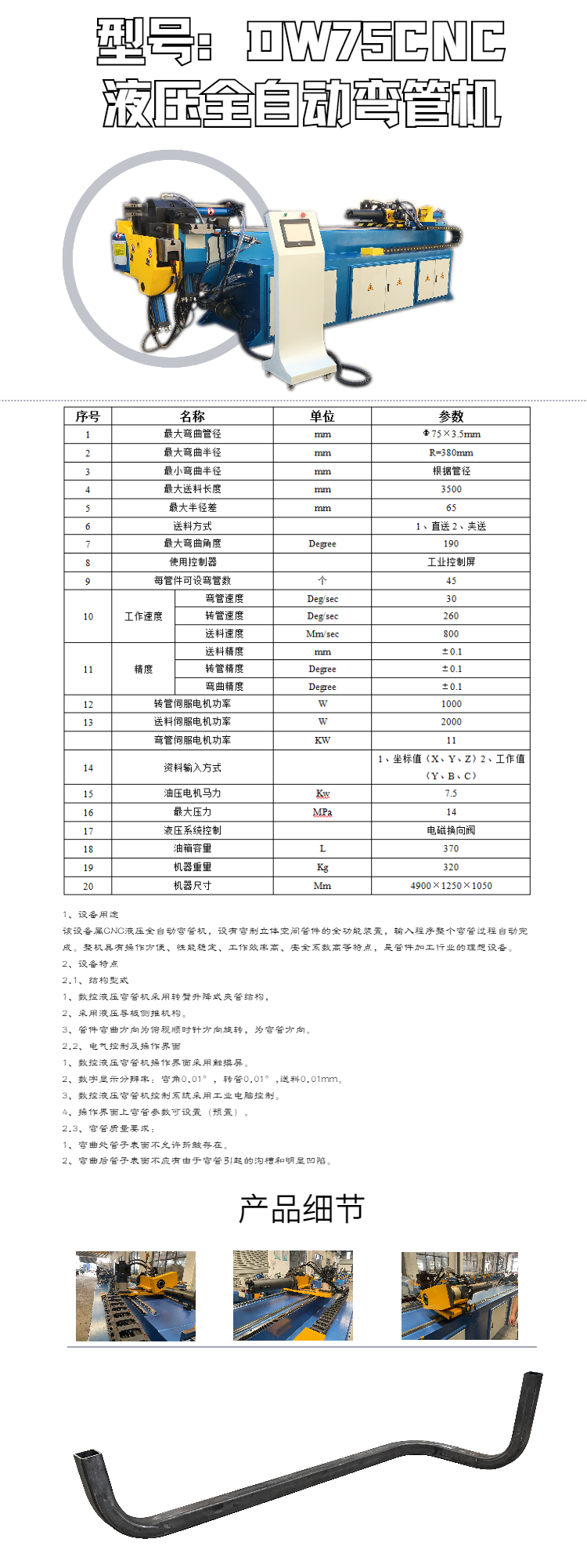 DW-75CNC2A/1S該設(shè)備屬CNC液壓全自動(dòng)彎管機(jī),設(shè)有彎制立體空間管件的全功能裝置,輸入程序整個(gè)彎管過程自動(dòng)完成。整機(jī)具有操作方便、性能穩(wěn)定、工作效率高、安全系數(shù)高等特點(diǎn),是管件加工行業(yè)的理想設(shè)備。?數(shù)控液壓彎管機(jī)操作界面采用觸摸屏,數(shù)字顯示分辨率:彎角0.15°,轉(zhuǎn)管0.1°,送料0.1mm。,數(shù)控液壓彎管機(jī)控制系統(tǒng)采用工業(yè)電腦控制,操作界面上彎管參數(shù)可設(shè)置(預(yù)置)。