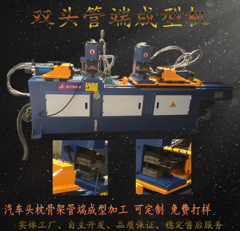 1.本機(jī)針對于汽車頭枕骨架管端縮口成型加工研發(fā),采用雙管雙頭同時(shí)加工、一次成型、效率非常高,由于采用雙頭成型、大大改善了單頭成型管件同心度問題。